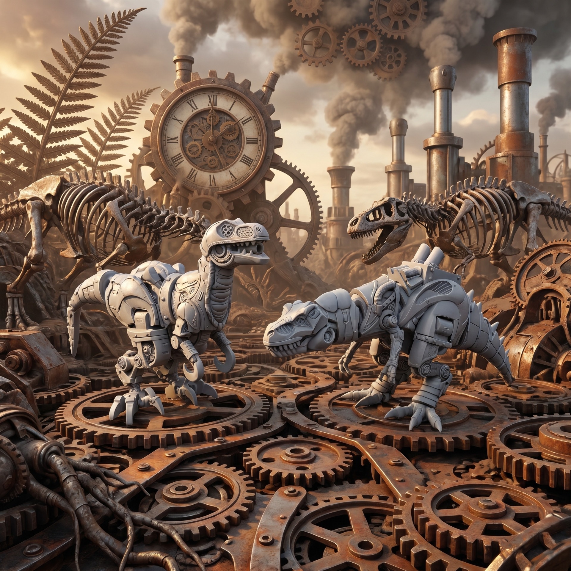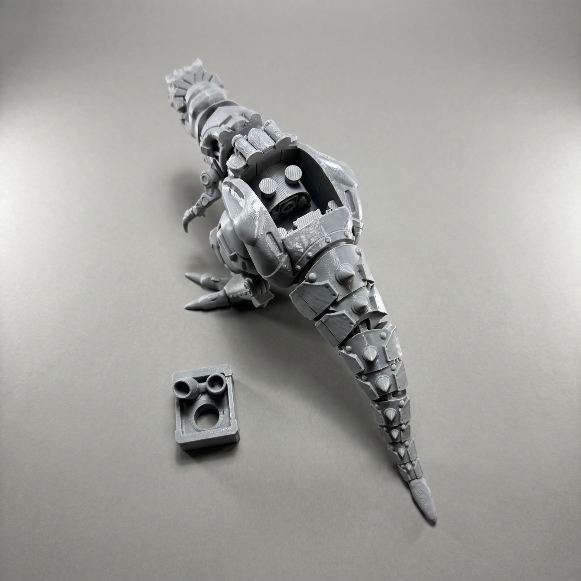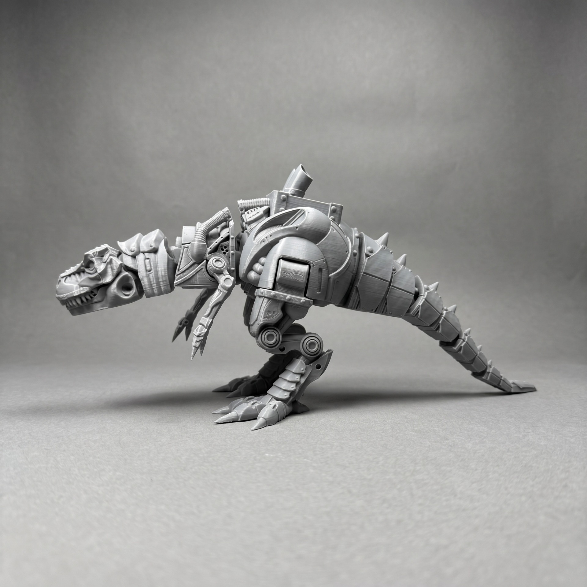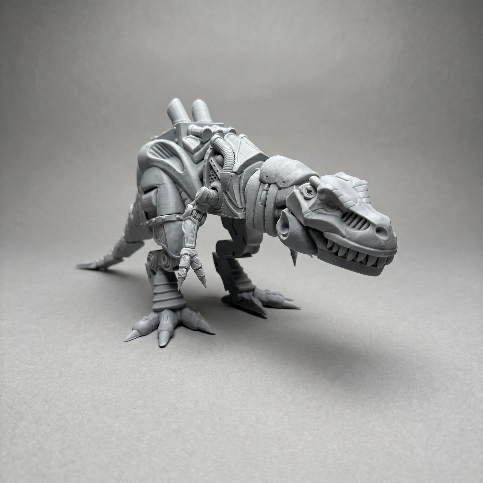 Obří mechanický Turbo T-rex. Kompletně pohyblivý od tlamy po ocas. na hřbetu pod výfuky schovává i malou strojovnu.