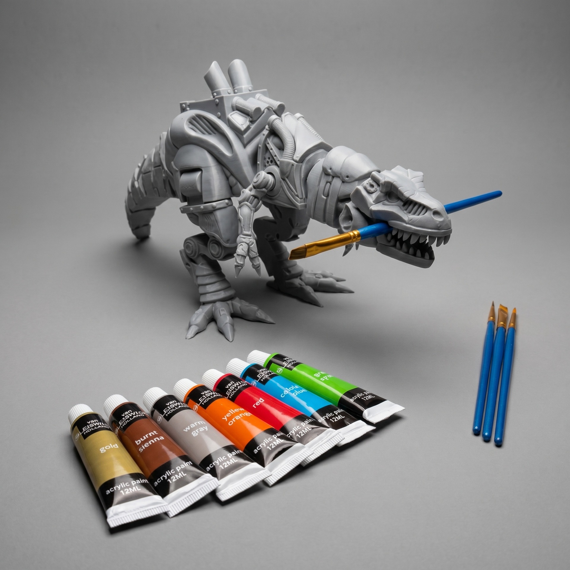 Balení obsahuje: Turbo T- rex včetně krytu strojovny, sadu akrylových barev 8x12ml, sadu štětců 4ks